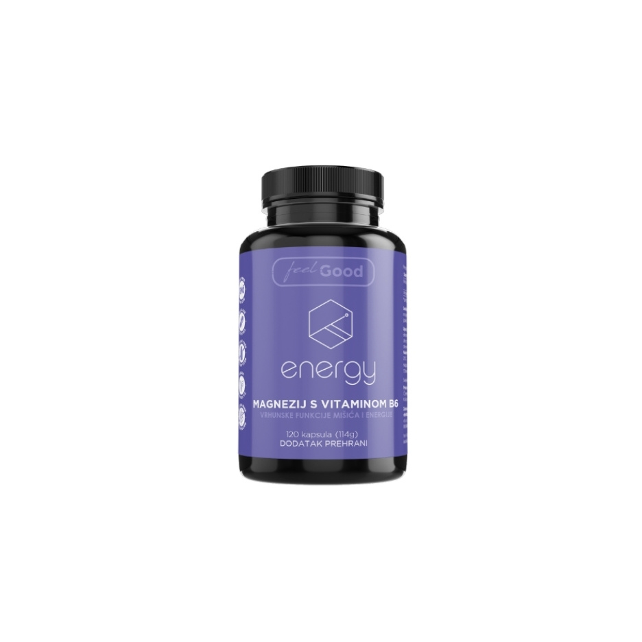 Feel Good Energy Magnezij s vitaminom B6, 120 kapsula je dodatak ishrani osmišljen za podršku funkciji mišića, nervnog sistema i smanjenju umora i iscrpljenosti. Kombinacija magnezija i vitamina B6 doprinosi normalnom metabolizmu energije, mišićnoj funkciji i ravnoteži elektrolita.
